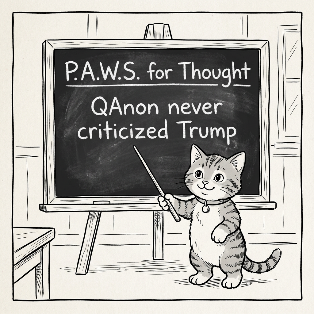Here’s where the gentle unlock comes in. QAnon thrived on cognitive dissonance: when facts clashed with belief, the brain rationalized (“it’s part of the plan”). Studies on Q followers highlight confirmation bias, need for closure, and emotional investment. Questioning feels like betrayal because the community and identity are wrapped up in it. That’s why a kitten on a chalkboard works—it’s non-threatening. “Paws for thought” echoes the lingo without mocking: Trust the plan… but maybe verify? Curiosity isn’t disloyalty. It’s what smart cats do—bat at the yarn, see if it unravels.